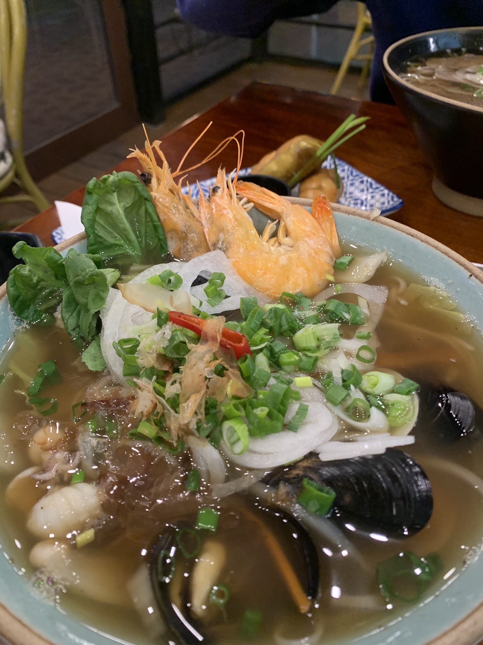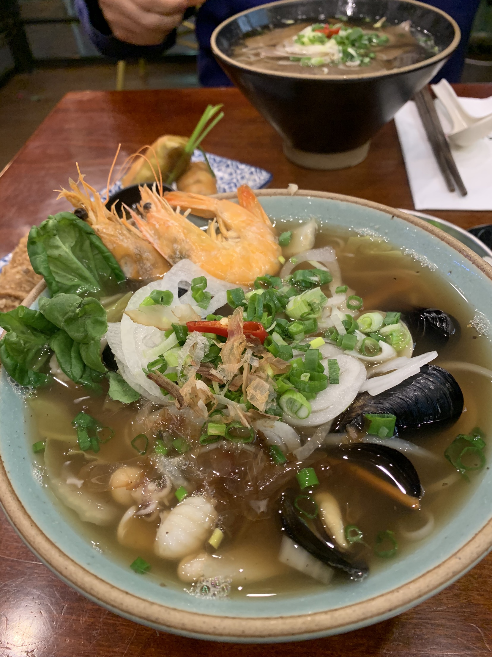 제가 주문한 퍼도, 해산물 쌀국수에요. 새우2마리와 홍합, 바지락, 오징어, 쭈꾸미가 들어있어요. 소고기 쌀국수와 다른점은 청경채와 가쓰오부시(가다랑어포)가 뿌려져있다는 것! 건더기가 제법 넉넉하게 들었어서 아쉽지 않게 먹었어요. 숙주는 국수 아래에 깔려있으니 잘 뒤적뒤적해서 드셔야해요.해산물 베이스이니 만큼 국물 맛이 시원~하고 깔끔합니다. 헤비한 저녁을 먹고 싶지 않았던 저에게 딱 맞는 메뉴였어요. 쭈꾸미들이 아주 귀여운 베이비 사이즈였지만 한 입에 쏙쏙 넣어 먹기에 좋았어요.