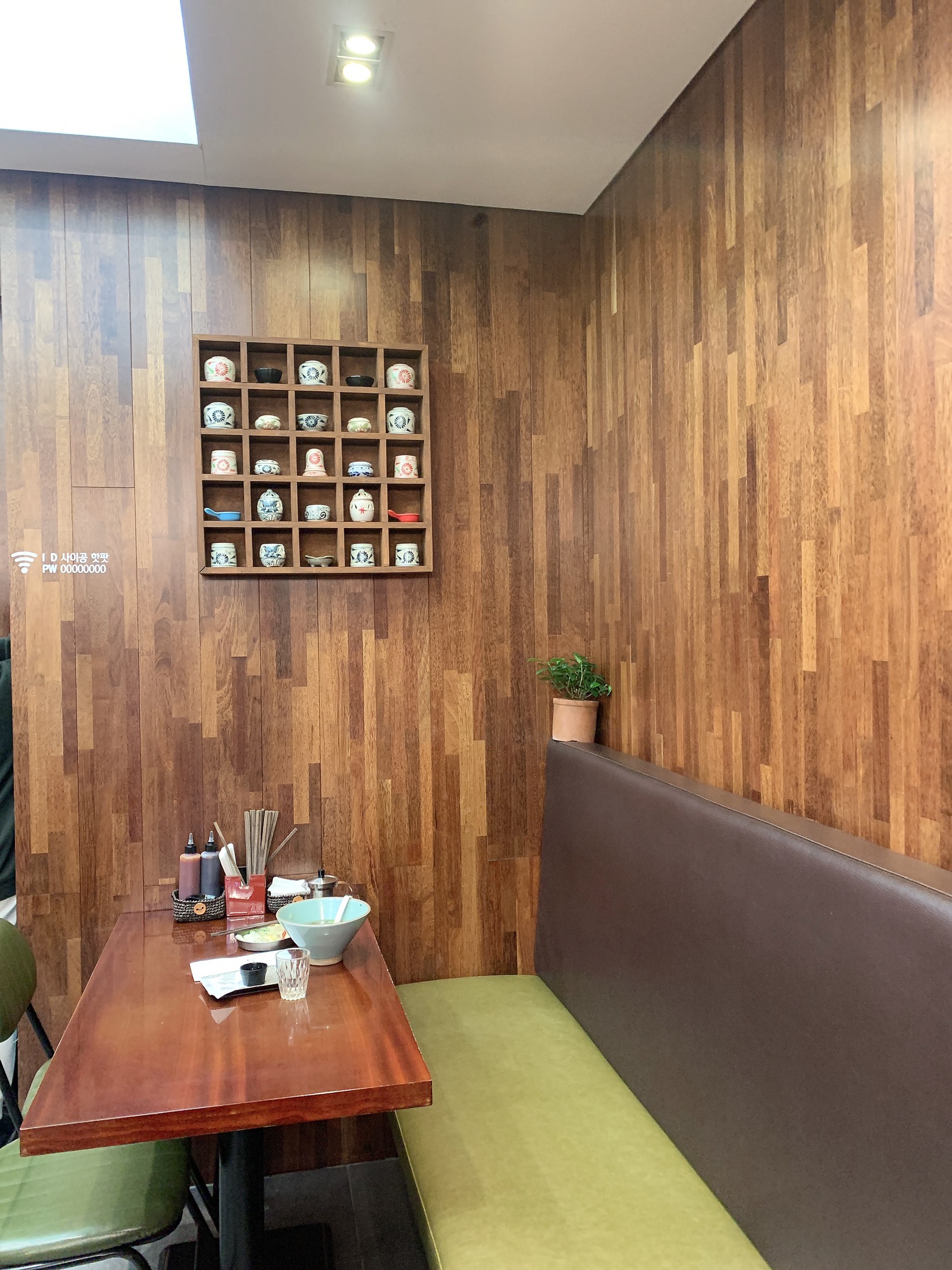 가게 규모가 크지는 않아요. 아담한 크기입니다. 실내석에는 4인석 4테이블이 있고 베란다석에는 4석 2테이블, 2인석 2테이블이 있어요.
