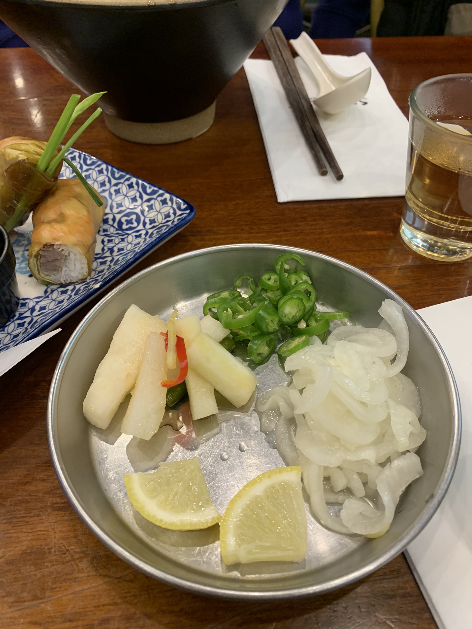 기본으로 나오는 찬이에요. 무우 피클, 양파절임, 레몬, 청양고추.