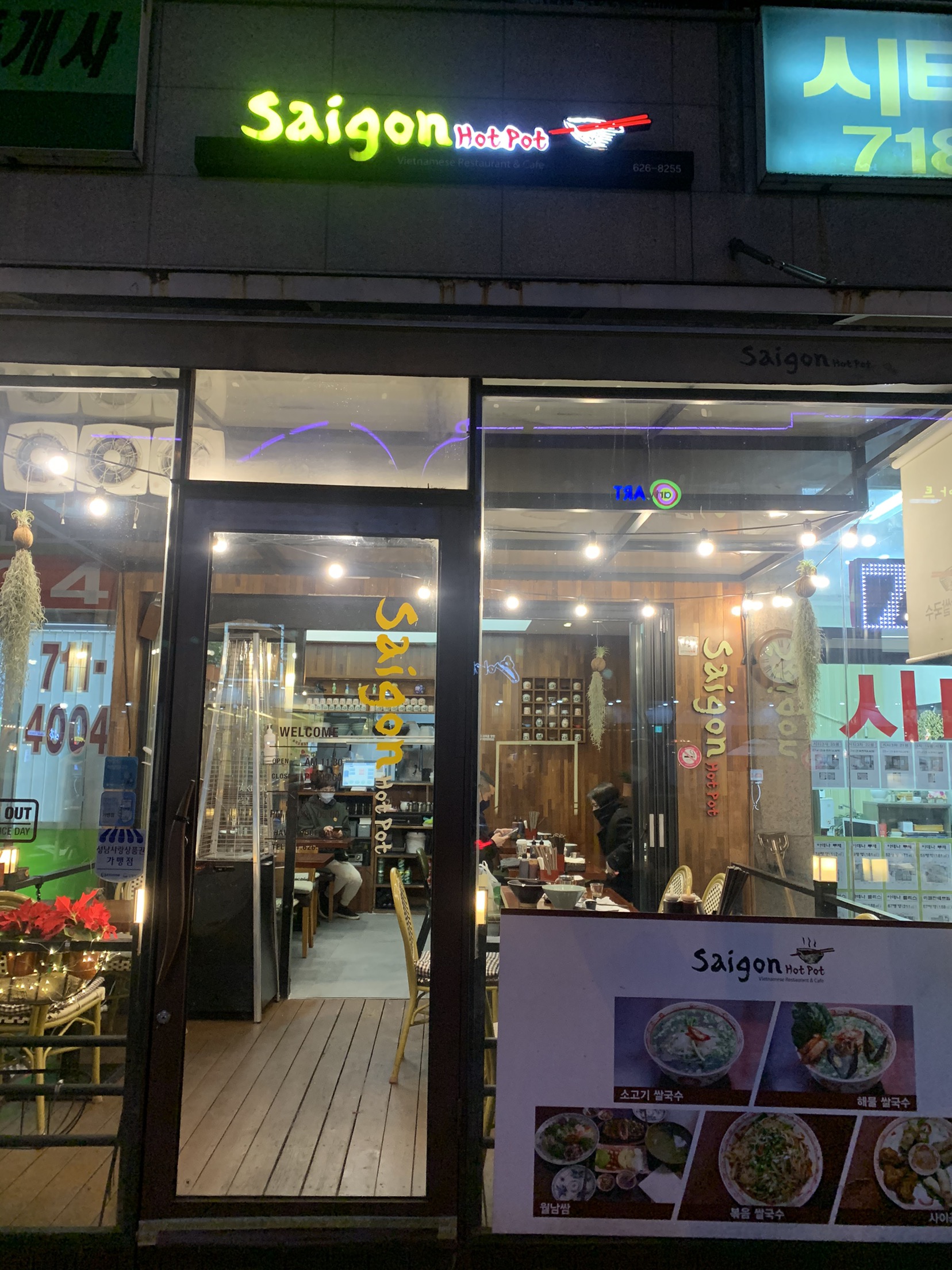 칼바람이 불기 시작한 오늘은 퇴근길에 뜨끈한 국물이 절실했어요. 약간 피곤했던지라 너무 무거운 음식은 피하고 싶어서 뭘 먹을까 고민하며 정자역에서 부터 엠코헤리츠까지 걸어가는 동안 썩 땡기는 메뉴를 찾지 못했었어요. 포기하고 집에나 가자~ 하던 찰나에 생각난 쌀국수! 동네에 있는 쌀국수집은 거의 다 가봤는데 어쩌다 보니 이 집은 첫 방문이 되었어요. 항상 사람이 많아서 피해갔던 음식점 중에 하나였던 사이공 핫팟. 오늘은 다행히 북적이지 않아서 바로 입장했어요.