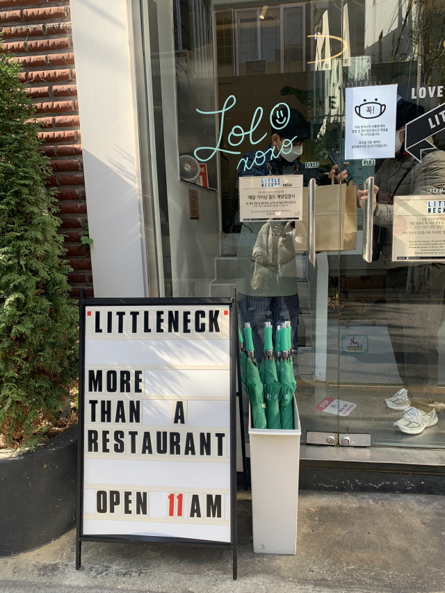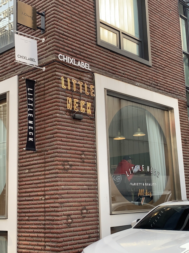 압구정로데오역에서는 도산공원 방향으로 걷다보면 도보 5분정도 거리에 있어요. 화려한 외관은 아니라서 딴생각하면서 걷다가 지나쳐서 다시 되돌아갔어요ㅎㅎ 수수하게 생긴 벽돌건물에 아기자기하게 걸려있는 리틀넥의 간판을 볼 수 있어요.