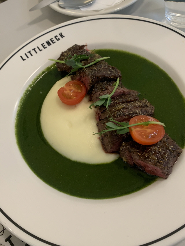 리틀넥 청담의 시그니처 메뉴 중 하나인 '하우스 스테이크'. 고기는 살치살이고 으깬감자와 바질소스가 곁들여진 메뉴에요. 저는 스테이크를 정말 좋아하는 미트러버인데, 아웃백의 토마호크 스테이크 외에는 맛있는 스테이크를 찾지 못했었는데 드디어 마음에 쏙드는 스테이크를 찾았어요! 뜻밖에 만난 맛있는 스테이크에 정신없이 흡입ㅎㅎㅎ 고기도 야들야들하고 소스도 정말 맛있어서 완전 행복!
